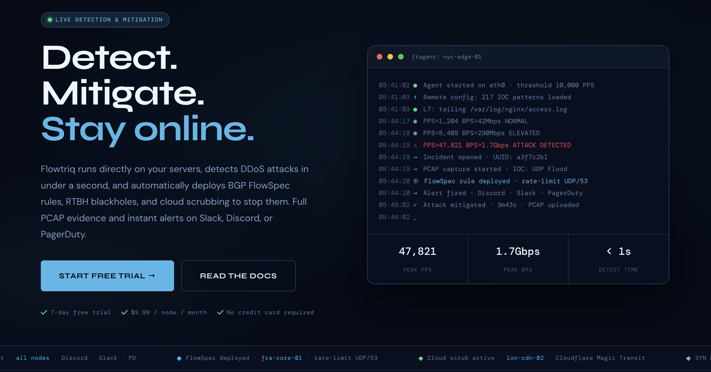 Flowtriq complements these by detecting at the server edge, firing FlowSpec/RTBH instantly, and escalating to scrubbing only when needed—reducing cost and time-to-mitigation. If you already run a scrubbing backbone, Flowtriq becomes your per-node sensor and orchestration brain. If you don’t, it’s a pragmatic “First Look” that closes your biggest gap now and scales later.